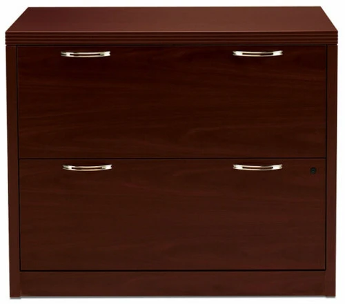 This 2 drawer lateral filing cabinet from HON features an abrasion and stain resistant laminate and is available in either a mahogany finish with nickel crescent pulls or a bourbon cherry finish with brass loop pulls.